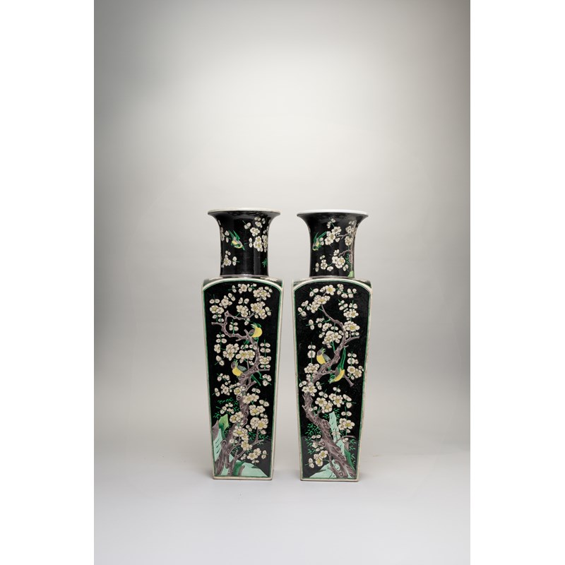 With square tapering bodies painted with yellow and green birds perched in flowering prunus trees, six character Kangxi marks, 50cm. (2)