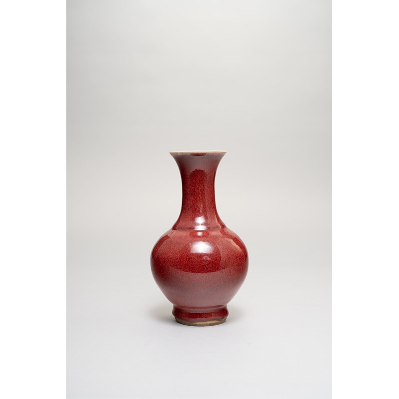 A SMALL CHINESE FLAMBE GLAZED BOTTLE VASE