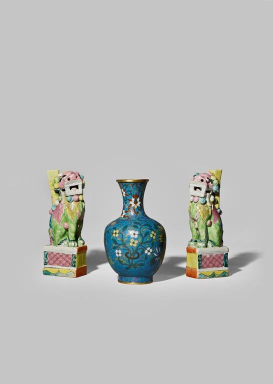 The ovoid body decorated with chrysanthemums, lotus and other blossoms, the neck with stylised lotus, all on a turquoise ground, together with a pair of famille rose Buddhist lion dogs, 21.5cm max. (3)
