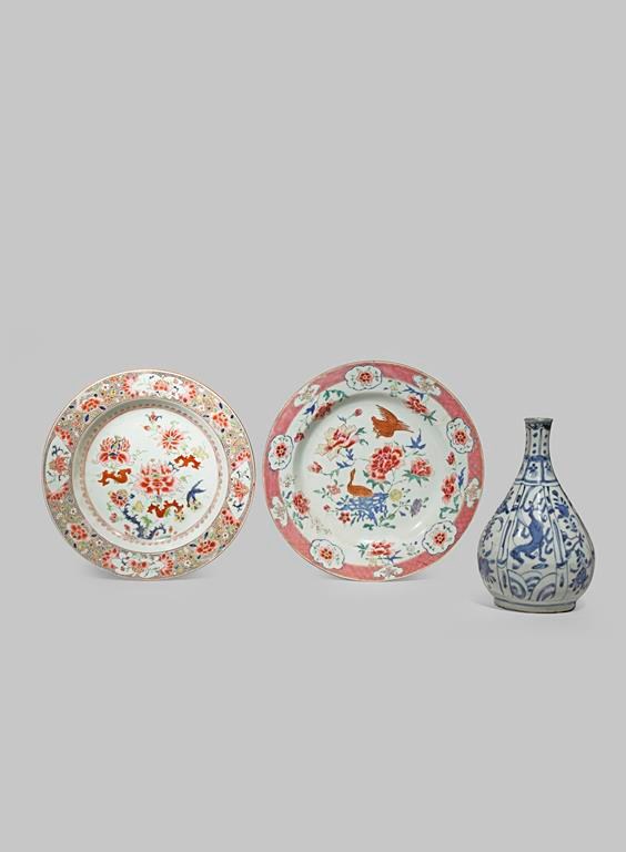 TWO CHINESE FAMILLE ROSE DISHES AND A 'KRAAK' BOTTLE VASE 17TH AND 18TH CENTURY Variously...