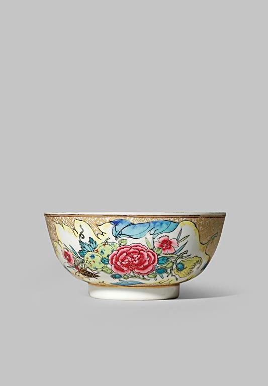 A CHINESE FAMILLE ROSE BOWL MID 18TH CENTURY The body decorated with two leaf-shaped panels both...