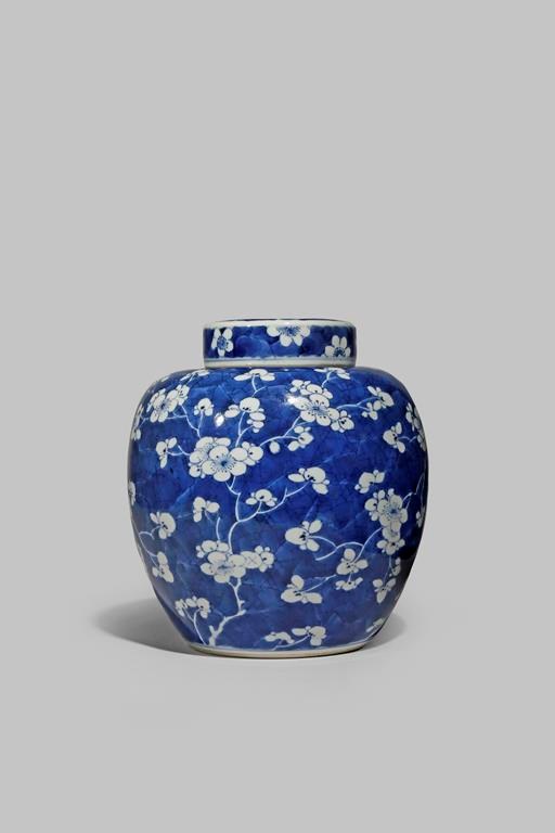 A CHINESE BLUE AND WHITE 'PRUNUS' JAR KANGXI 1662-1722 Decorated with blossoming prunus branches...