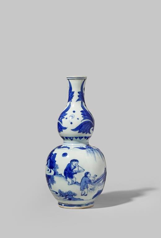 A SMALL CHINESE BLUE AND WHITE GOURD-SHAPED VASE TRANSITIONAL C.1640 The lower section of the...