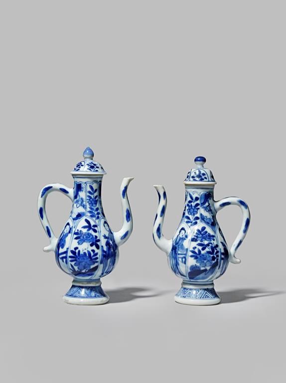 TWO CHINESE SMALL BLUE AND WHITE EWERS KANGXI 1662-1722 Both moulded with panels and painted with...