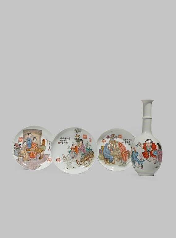 THREE CHINESE FAMILLE ROSE DISHES AND A BOTTLE VASE