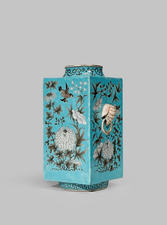 Painted en grisaille with the autumn pattern of hwamei birds, chrysanthemum and hibiscus blossoms against a turquoise ground, with two elephant handles and bands of key fret at the foot and flower sprays at the rim, 29.5cm.