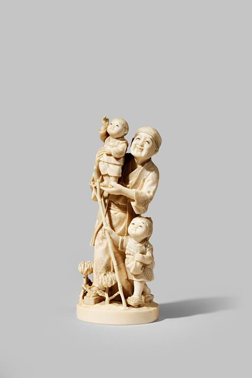 λ A JAPANESE IVORY OKIMONO MEIJI 1868-1912 Depicting an elderly man with two boys