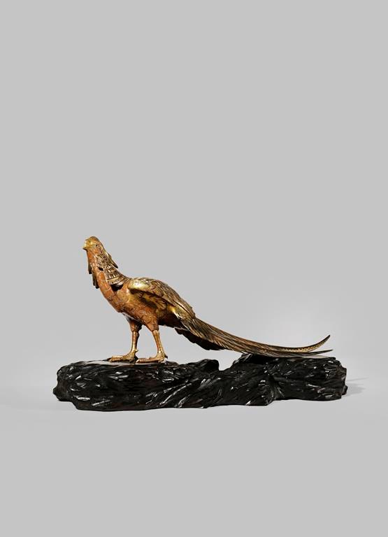 A JAPANESE GILT BRONZE OKIMONO OF A GOLDEN PHEASANT