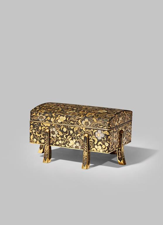 In the shape of a karabitsu (a traditional treasure chest), the body decorated with sakura flowers, buds and scrolling leaves inlaid in silver and gold on a dark ground, raised on six elegantly curved legs, the base inscribed Yoshitoyo saku (made by Yoshitoyo), 12.1cm. (2)