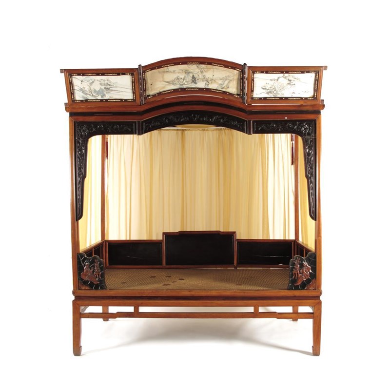 A Chinese hardwood day bed first half 20th century, the rectangular frame with a wickered base, panelled back and sides, all beneath a canopy with carved hardwood frieze beneath three glazed panels painted with figures in landscapes, minor damages, hung with a yellow net, 198cm x 226cm x 100cm.