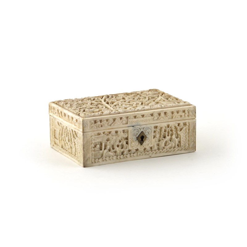A Chinese Canton carved ivory box 19th century, the hinged lid decorated with birds and bugs amidst bamboo, the sides with small figures in various pursuits, minor damages, 12.3cm.