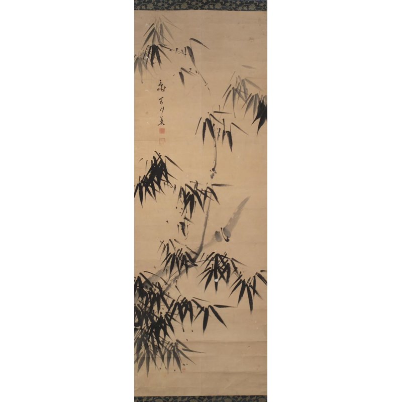 Two Chinese scroll paintings, one depicting donkeys, the other with bamboo and calligraphy, 68cm x 45cm and 130cm x 45.5cm respectively. (2)