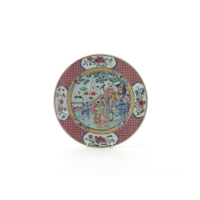 A Chinese famille rose plate c.1730, painted with two women and two children on a veranda beside a lotus pond, the border with four floral panels on a pink diaper ground, cracked and repaired, 23cm.