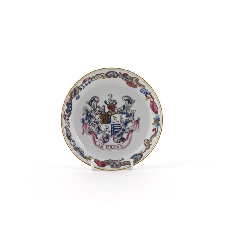 A Chinese armorial saucer 18th century, painted in blue, pink and gilt with a quartered coat of arms above the motto 'Le Grand', within a shell and scroll border, 13.5cm.