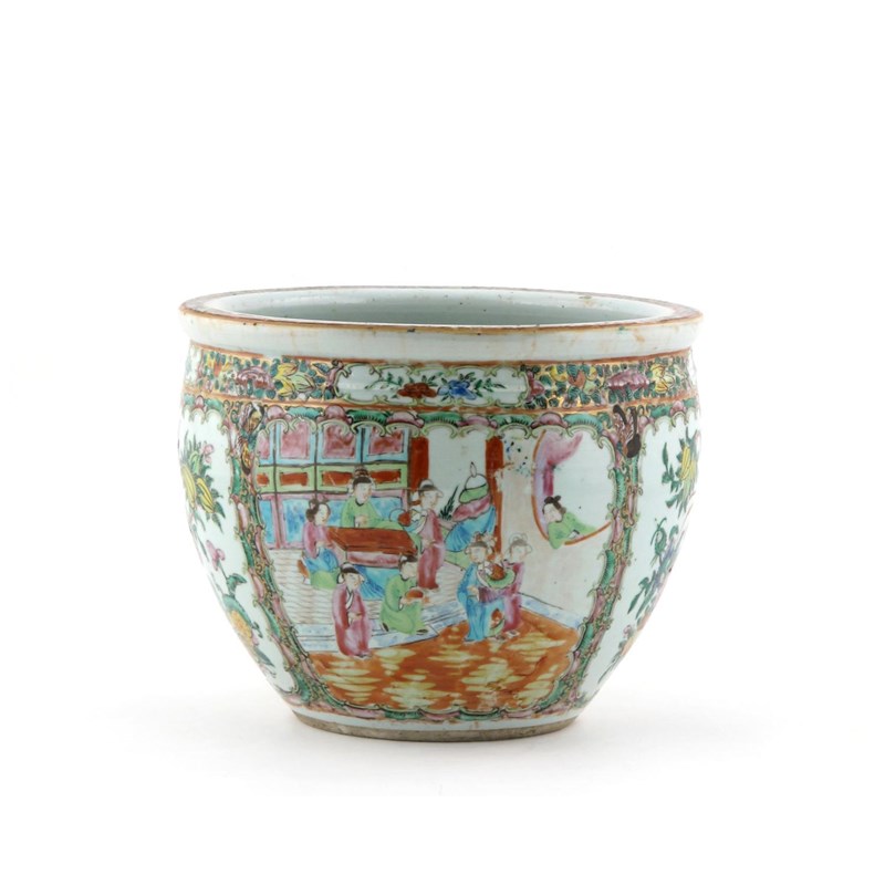 A Chinese Canton famille rose jardinière c.1880, typically painted with panels of birds, flowers, figures and fruit, 32cm.