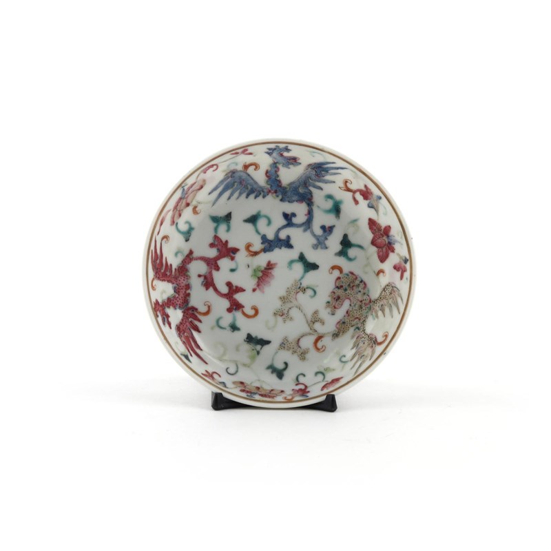 A Chinese famille rose small phoenix dish the base with a six character Yongzheng mark but later, enamelled with three mythical birds amidst leaf scrolls and flowers, 10.7cm.