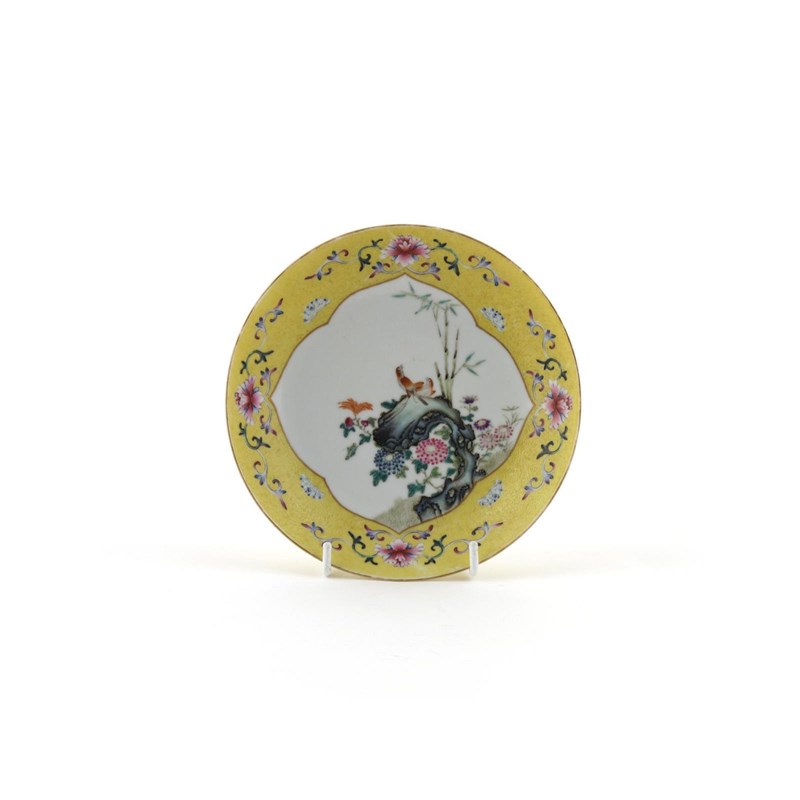 A Chinese small famille rose dish six character Guangxu mark and probably of the period, decorated with a quatrefoil panel containing birds, rockwork and flowers, the rim with a bright yellow sgratffito ground, the reverse with two dragons contesting flaming pearls, 16.6cm.