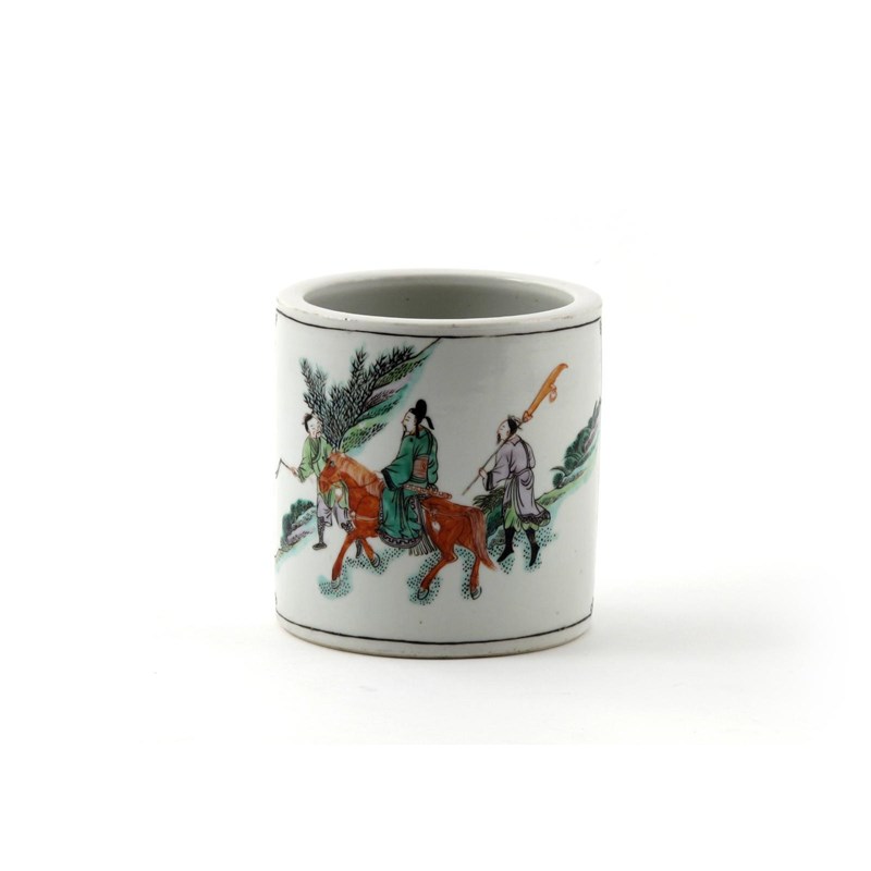 A Chinese famille verte cylindrical brush pot 19th century, painted with two panels of equestrian figures, unmarked, 13cm.