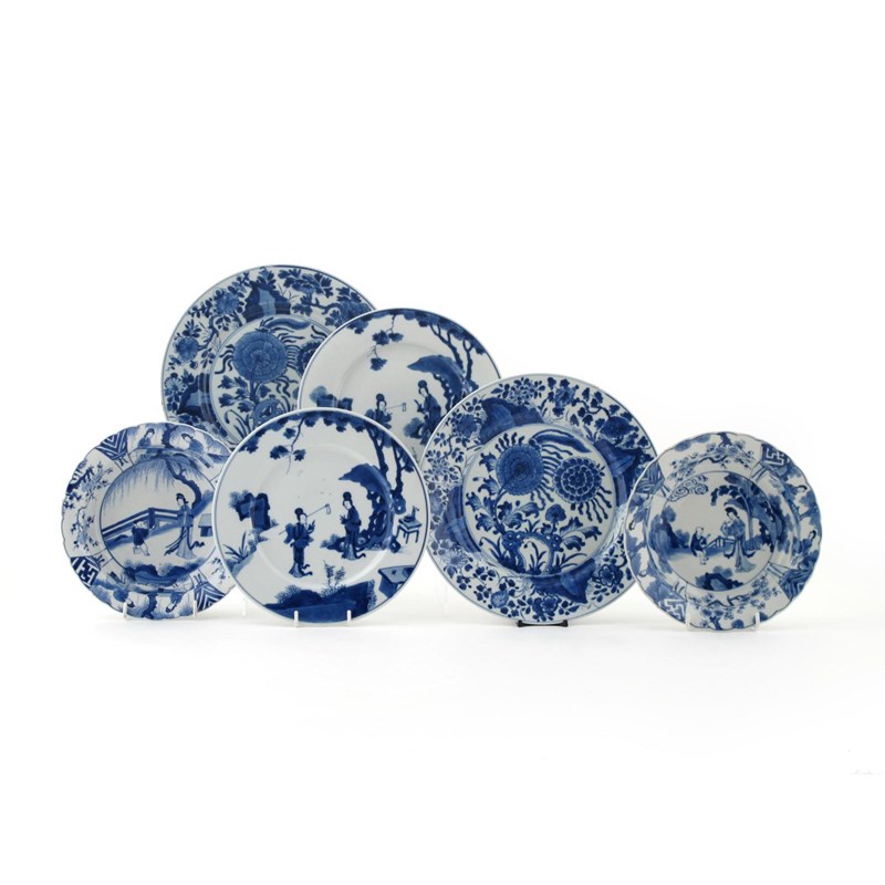 Three pairs of Chinese blue and white dishes Kangxi 1662-1722, variously decorated with figures beneath trees and with flowers and rockwork, twin fish and ding marks, 25cm max. (6)