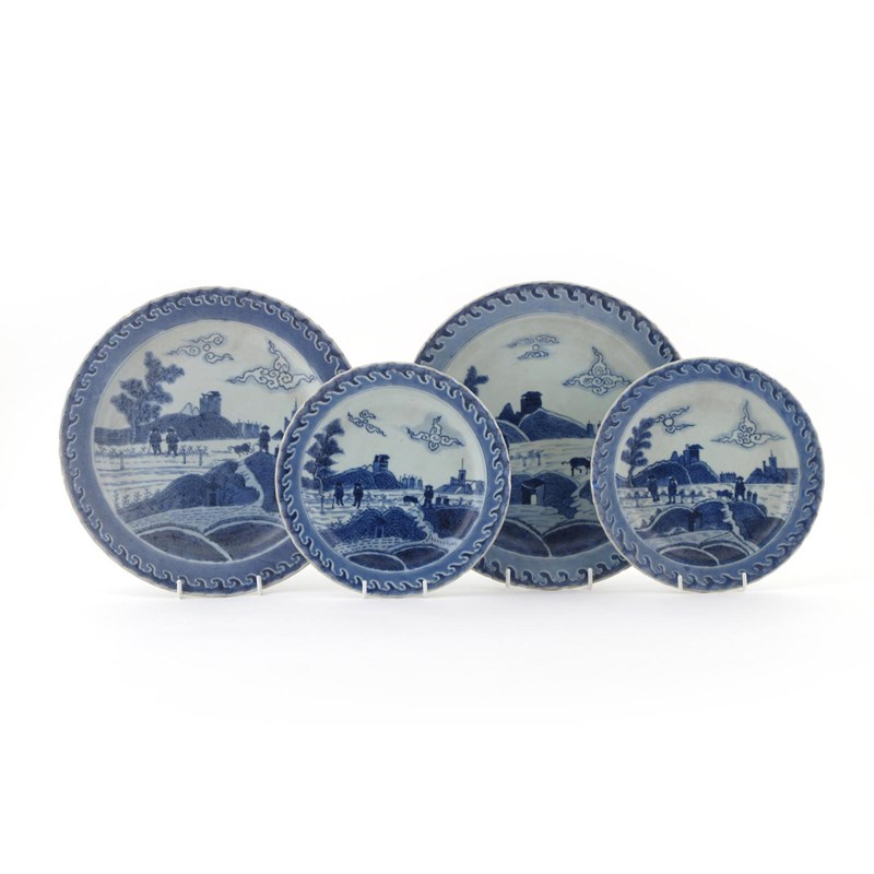 Four Chinese blue and white 'Deshima Island' plates c.1800, typically decorated with Dutch scenes probably of Scheveningen, the rims with wave designs, 26.6cm and 20cm. (4)