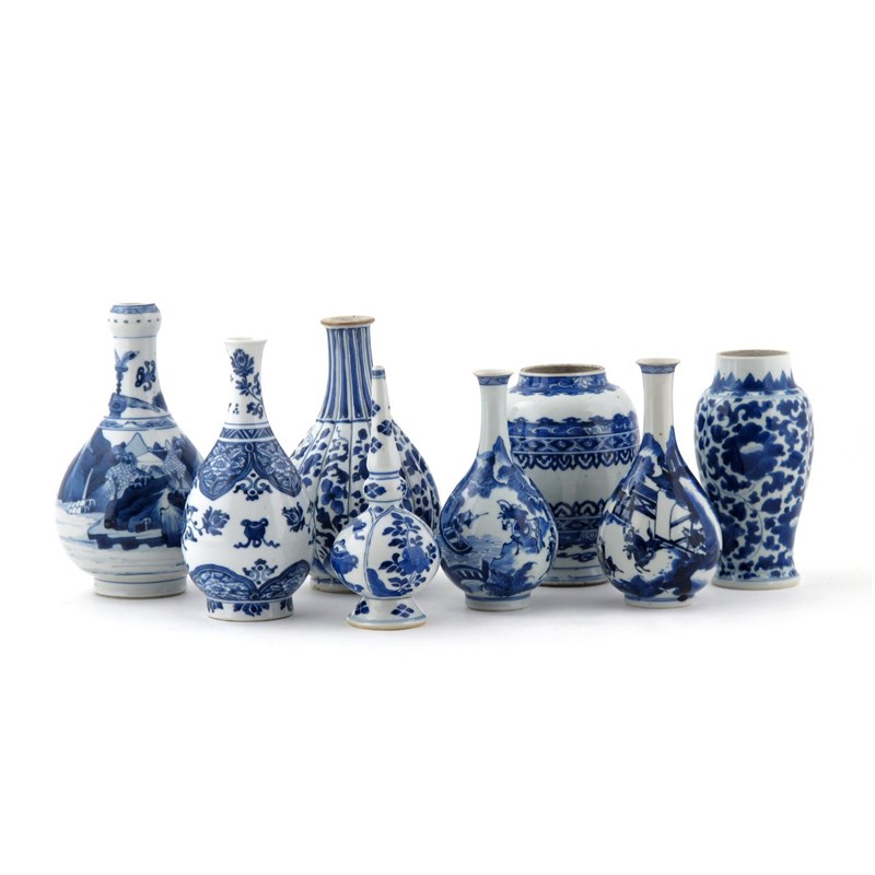 Eight Chinese blue and white vases all 18th century, variously decorated with figures, flowers, foliage, landscapes and geometric patterns, damages and repairs, 22cm max. (8)