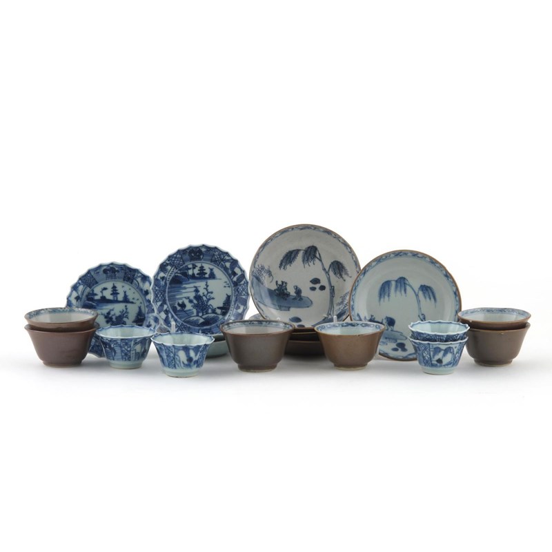 A collection of Chinese blue and white tea bowls and saucers 18th century, four painted in blue with watery landscapes, and five blue and brown glazed, painted with small figures beneath trees together with an additional tea bowl. (19)