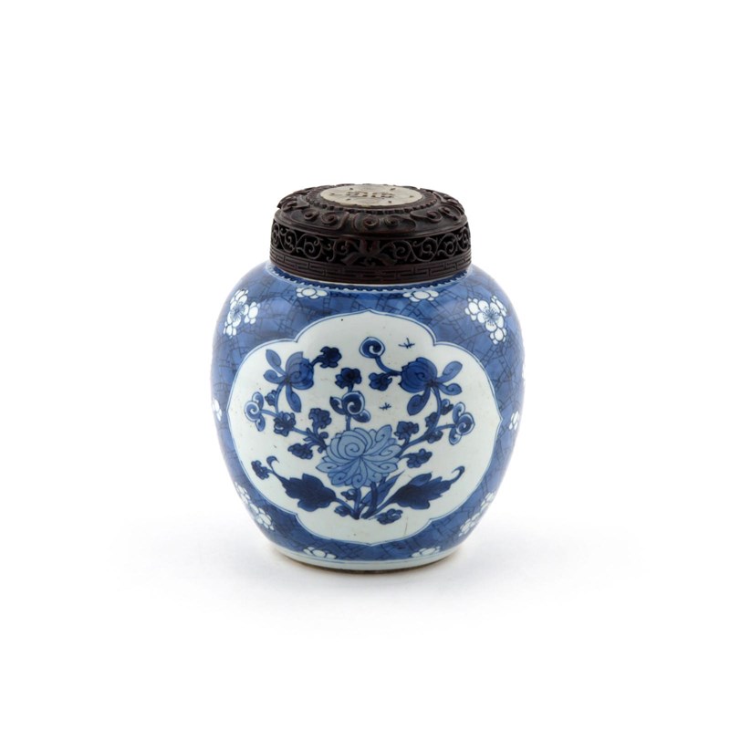 A Chinese blue and white ovoid vase Kangxi c.1700, painted with two panels containing flowers and vases on a prunus and cracked-ice ground, the pierced hardwood cover inset with a bowenite plaque, 20.5cm. (2)
