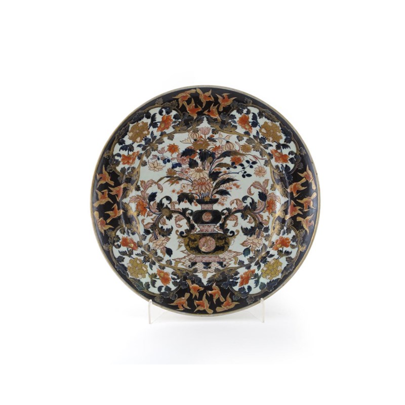 A large Japanese Imari dish c.1700, painted with a central vase, flowers and foliage, the border with panels of birds in flight, a flower mark to the base, 59cm.