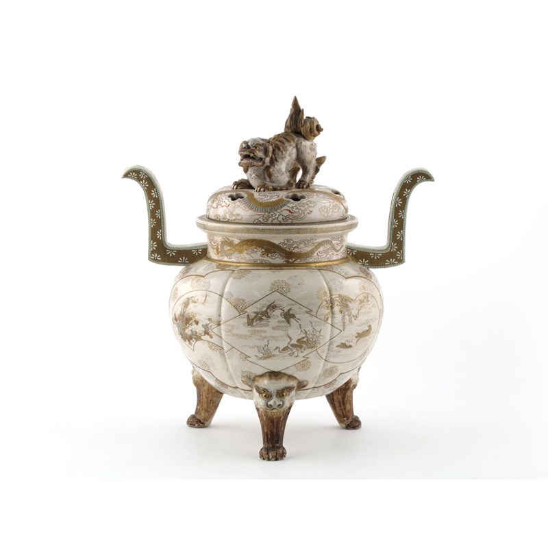 A large Japanese Satsuma koro and cover c.1900, with a lion dog knop, angled handles and mask-capped feet, some restoration, 49cm. (2)