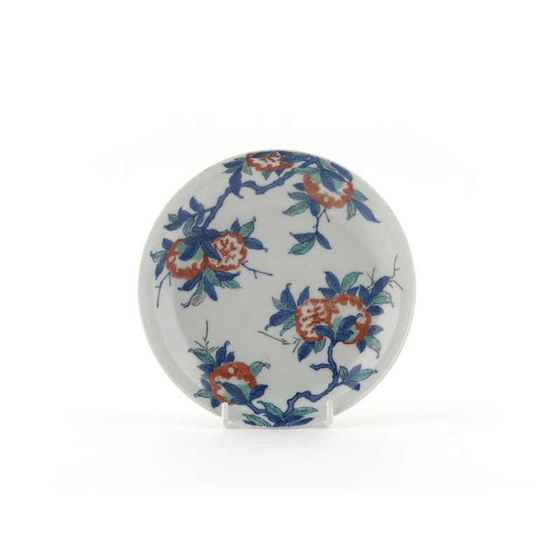 A Japanese Nabeshima dish 18th/19th century, painted with three fruiting branches, the reverse with three cash symbols and raised on a comb foot, 18.2cm.