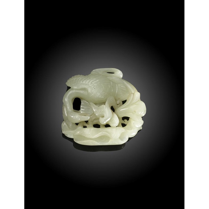A Chinese pale celadon jade reticulated plaque Jin/Yuan dynasty, carved with a small bird on the back of a goose amidst lotus, 7cm.