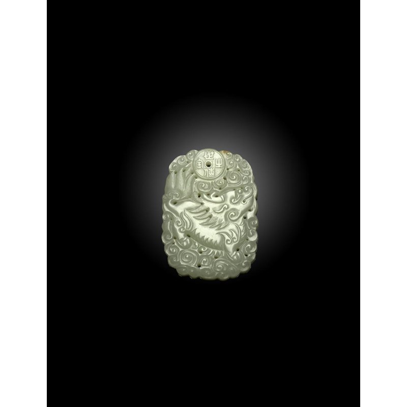A Chinese pale celadon jade pendant 19th century, crisply carved and reticulated with a mythical beast to each side beneath a cash symbol, carved with four character marks, 5.4cm.