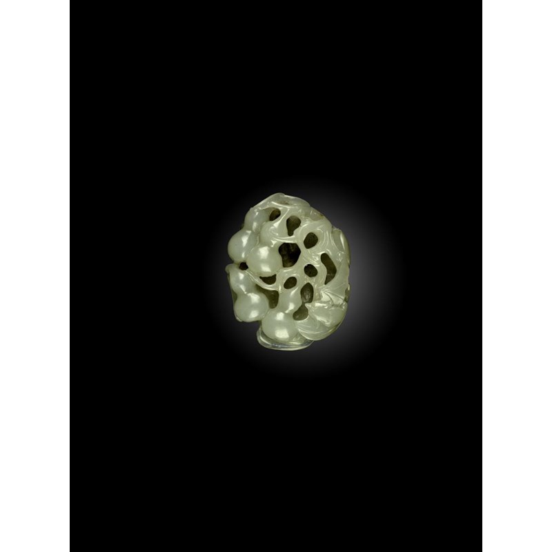 A Chinese pale celadon jade pendant 18th/19th century, carved as a single bat clambering on a gourd vine, the reverse with the brown skin of the pebble, 4.5cm.