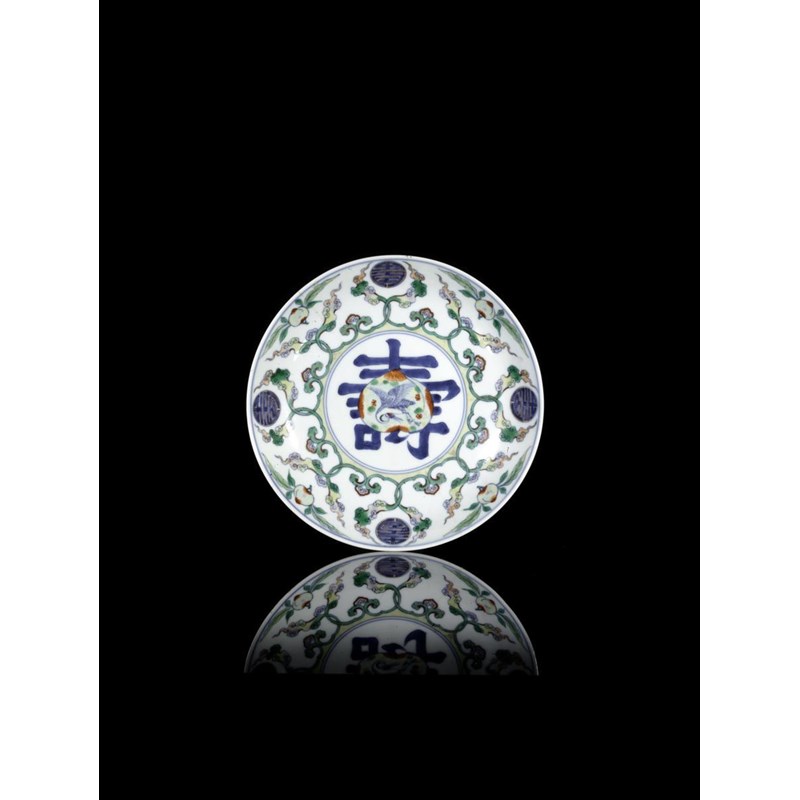 A rare Chinese doucai longevity dish six character Kangxi mark and of the period 1662-1722, painted with a central motif of a crane upon a peach, upon a shou character, within a wide formal border of scrolling ruyi-head emblems, shou roundels and peaches, the reverse with three groups of bamboo and lingzhi fungus growing from blue rocks, hair cracks, 21.2cm.