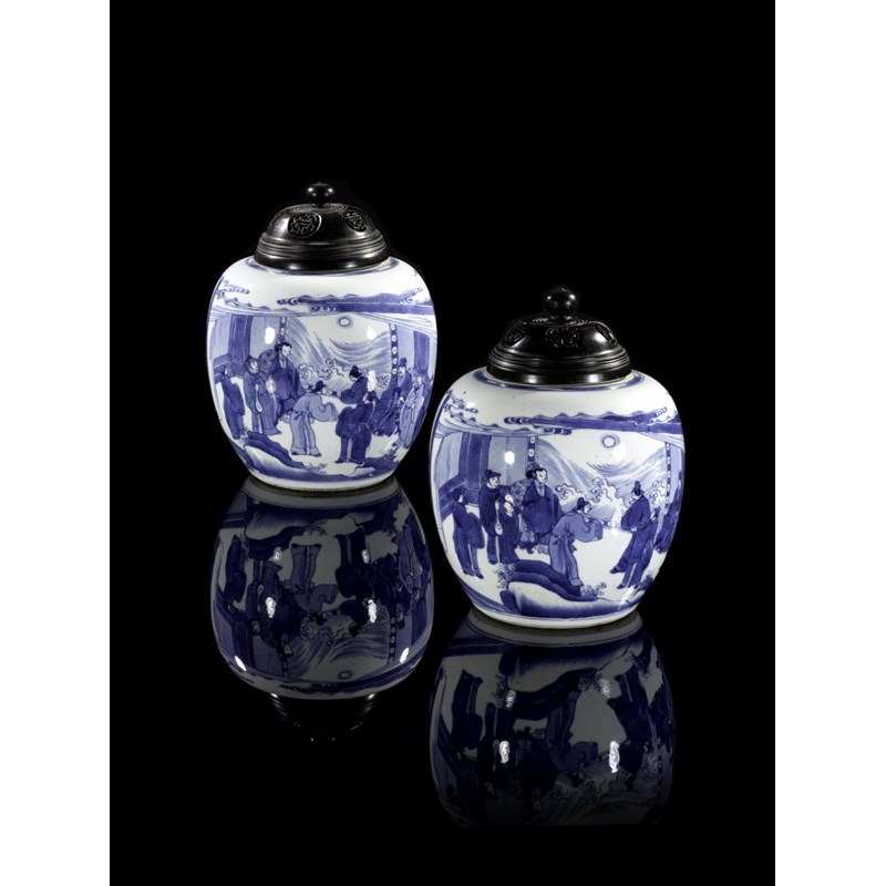 A fine pair of Chinese blue and white ovoid vases Kangxi 1662-1722, brightly painted in under-glazed blue with a group of figures assembled around a painting of breaking waves, the reverse with plantain, rockwork and clouds, each with a wood cover, 20.5cm. (4)