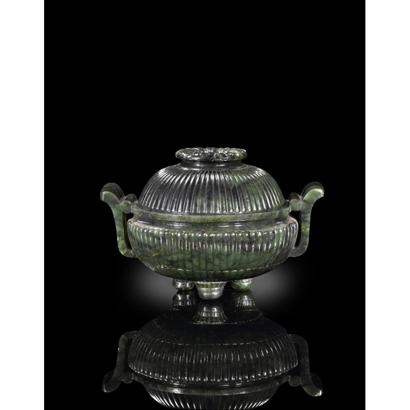 A Fine Chinese Spinach-Green Jade Tripod Censer and Cover