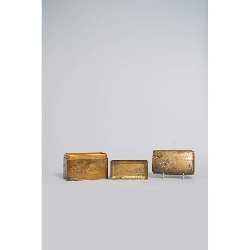 A JAPANESE GOLD LACQUER BOX, COVER, INNER TRAY AND DRAWER