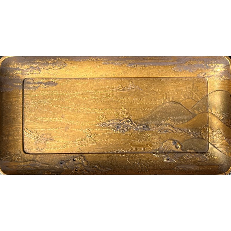 The tall rectangular body richly decorated with a continuous design of pavilions in a mountainous river landscape, one on tall stilts reminiscent of Kiyomizu-dera; with details rendered in hiramaki-e, takamaki-e and kirigane and with minute coral inlays; the sides and drawer with similar embellishments; the inner tray decorated with fishermen on small boats casting their nets amongst the waves, the reverse with brocade patterns, 14.5cm x 12cm x 21.5cm. (4)