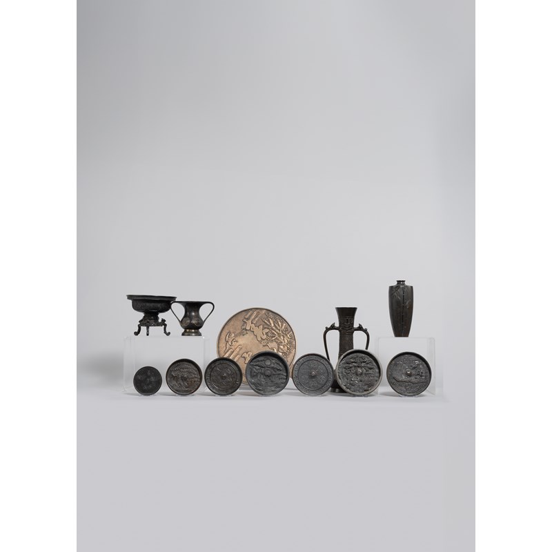 Comprising: eight circular mirrors of various sizes, decorated with birds, flowers, calligraphy and other auspicious designs; a double-handled vase with crashing vases and archaistic patterns, and another smaller one decorated with spirals; a koro with a wide rim raised on a tripod stand, signed underneath; and a tall cylindrical vase decorated with bamboo, with the Nogawa mark to the base, 31.8cm max. (13)