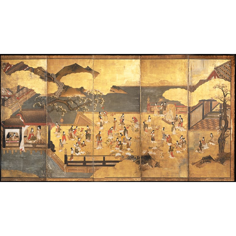 A Japanese five-fold byobu (paper screen), lavishly painted in ink, colour, and gold leaf on paper; embellished with the Chinese Imperial couple watching court ladies fencing with bouquets of flowers attached to long poles, the Emperor sat on a throne to the right of the composition and the Empress depicted in a pavilion on the left, both with attendants carrying goods; the courtyard and pavilions by a lake and with a waterfall flowing down a mountainous outcrop in the distance, with gold clouds above; 169.5cm x 315cm overall.
