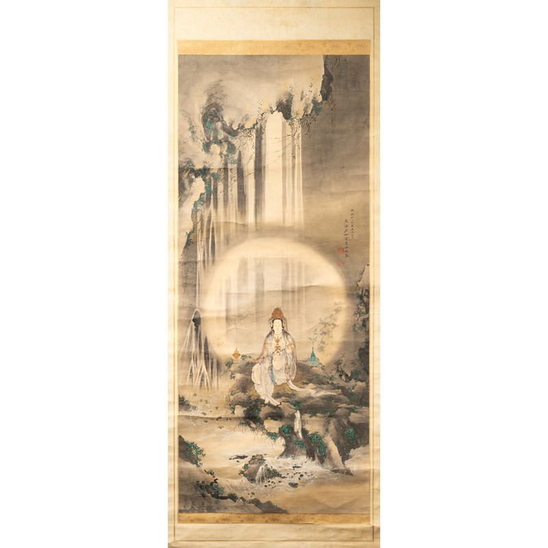 A Japanese kakemono (hanging scroll painting), ink, colour and gold on paper, depicting a serene-looking Kannon wearing long flowing robes, an ornate necklace and elaborate headdress; the Goddess of Mercy is sitting on a rock before a tall waterfall, the water meandering below; a vase with a bamboo sprig standing in a dish to her left, and a tripod incense burner to her right; with two lines of calligraphy reading Ansei yon hinoto mi natsu go chushi hi, Sessen Tsukioka Kiyoshi (Ketsu) kaori ni moku shi ogami utsusu (Painted by Tsukioka Sessen, artist name Kiyoshi/Ketsu, bathed in an incense fragrance, in the middle of the fifth month, during the summer, in the year of hinoto-mi, Ansei 4th year -1857), and with two red seal marks, 126.5cm x 53cm.