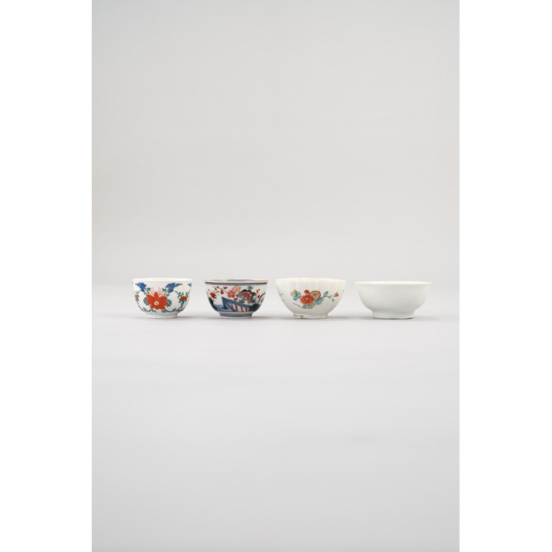 The first embellished with flowerheads linked by leafy scrolls; another with flowering prunus in a garden; the third left blank, with a subtle white slip decoration of chrysanthemum flowerheads and scrolling tendrils; the last with a scalloped rim and painted with pomegranates to the well, three floral sprays to the reverse, 8.4cm max. (4)