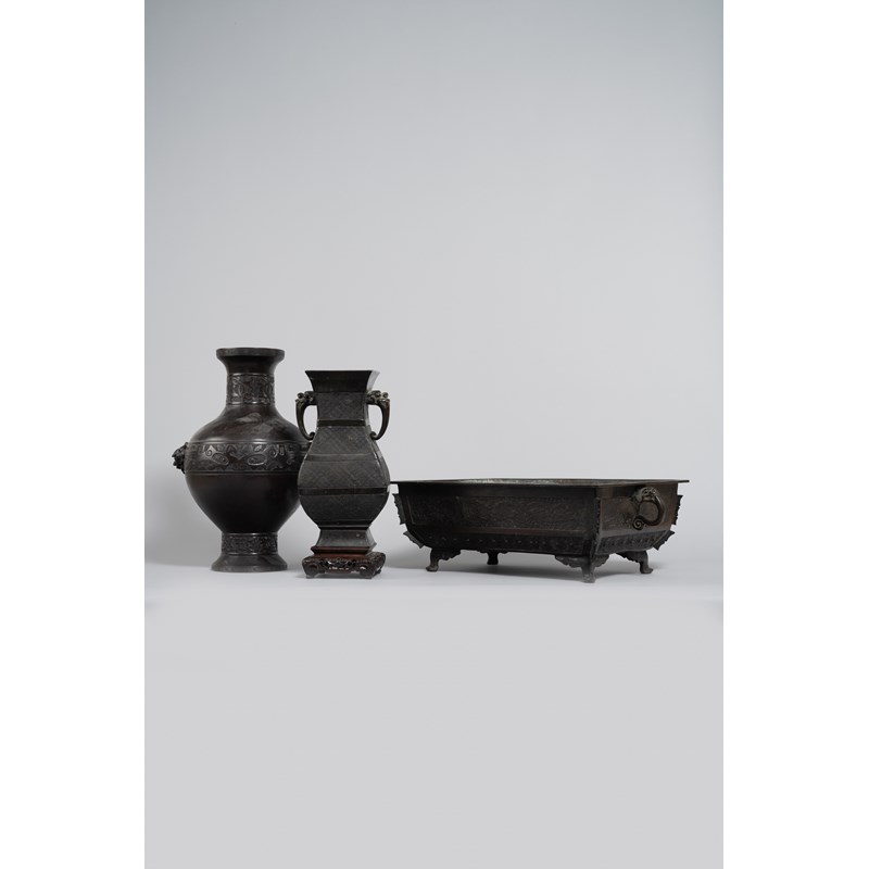 TWO CHINESE ARCHAISTIC BRONZE VASES AND AN INCENSE BURNER