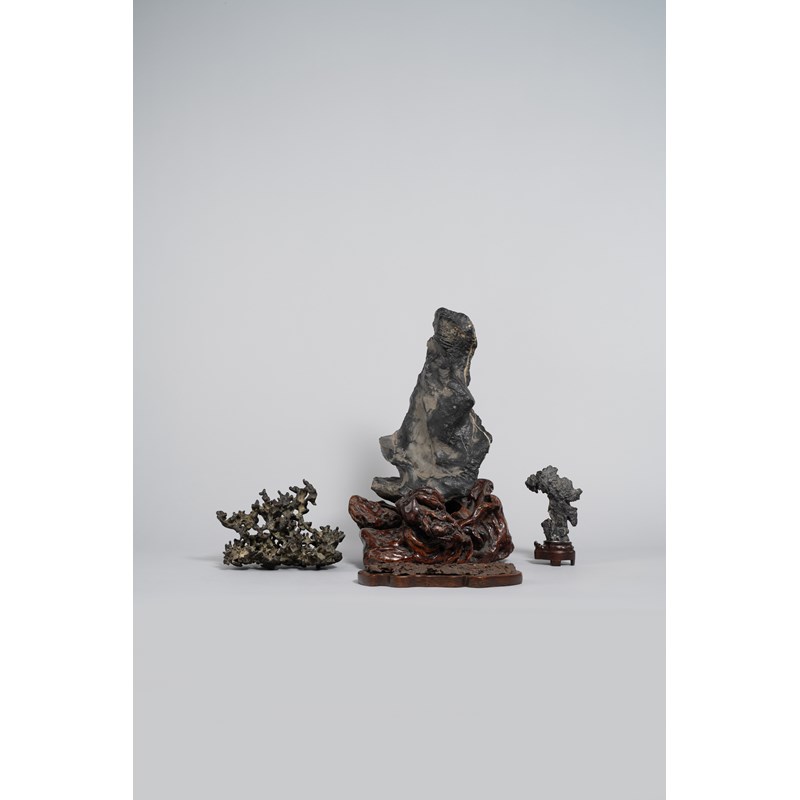 Both with wood stands, together with a flat iron sculpture and a stand, and another piece in bronze modelled as breaking waves, 42cm max. (6)