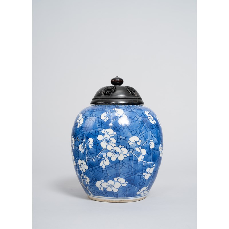 The body brightly painted with prunus on a cracked-ice ground, together with a wood cover, 17.5cm. (2)