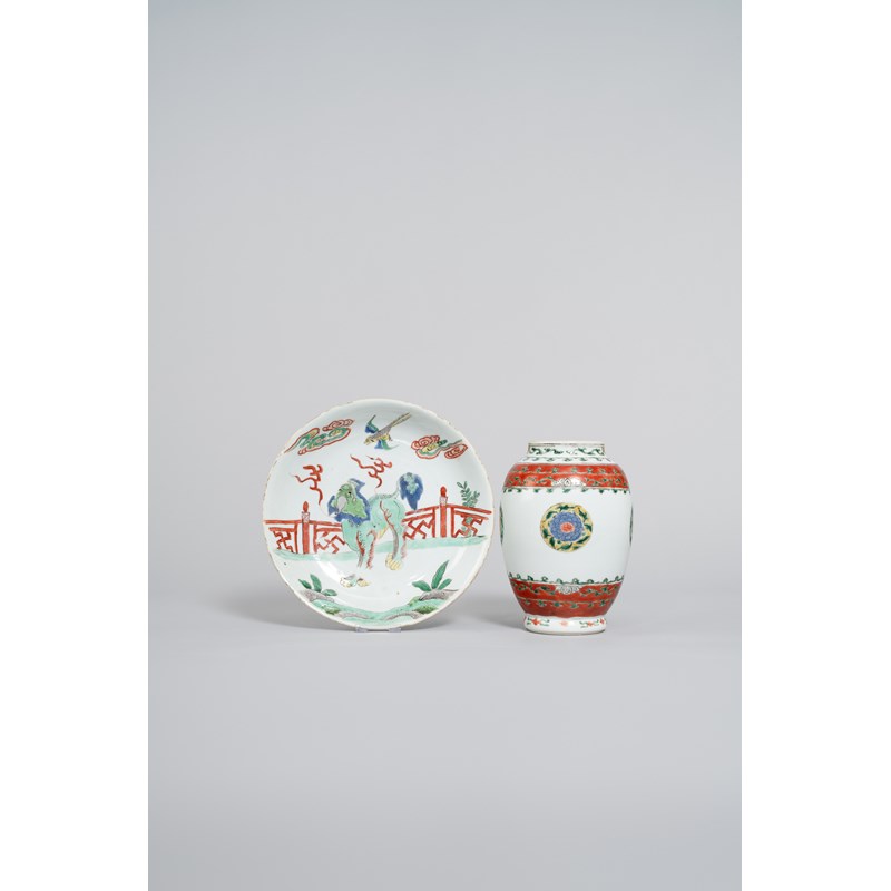 A CHINESE FAMILLE VERTE 'QILIN' DISH AND AN OVOID JAR
