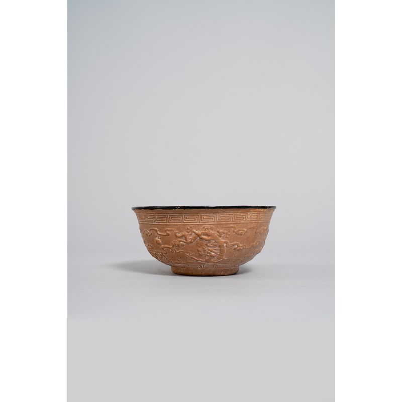 A RARE CHINESE IMPERIAL MOULDED GOURD 'DRAGONS' BOWL