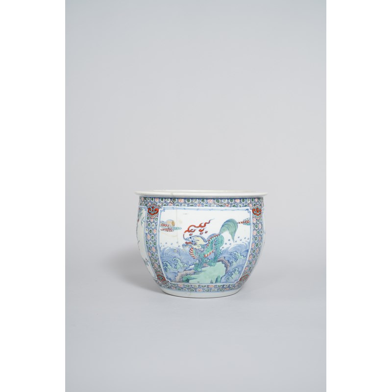 The exterior painted with two large panels, each enclosing a qilin standing on green rocks and breathing fire, the panels divided by smaller panels with a magpie on a prunus branch and butterflies amidst chrysanthemum, all on a cell-diaper ground, with a paper label reading 'OCS 2006, THE WORLD IN COLOURS, NO.81', 22.5cm.
