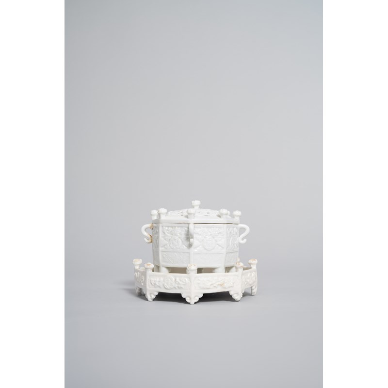 A CHINESE BLANC DE CHINE 'MARCO POLO' INCENSE BURNER, COVER AND STAND
