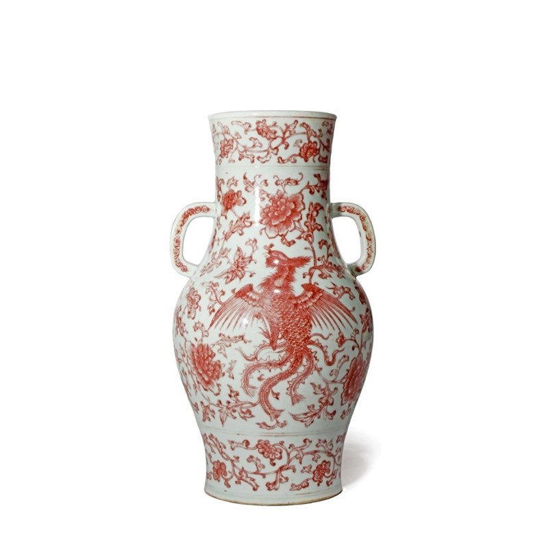 The wide cylindrical neck with two lug handles, the ovoid body painted with a phoenix to each side, its wings and long tail feathers extended in flight, encircled by a continuous scroll of peony flowers and foliage, bordered by scrolling bands to the neckrim and foot, 34cm.